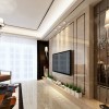 本套房房屋装饰的比较大气,客厅中的石膏板吊顶采用了平顶式,但并不会使人觉得单调,因为设计师巧妙的云龙了黑色的装饰线条进行了圈边处理,不仅增强了设计感,也将中间的水晶吊灯衬托的更加唯美、精致,一款棕色的皮质沙发上搭配了色彩不一的布艺抱枕,整体搭配效果显得非常高档,同时也可以带给人们无限的舒适感,中间则摆放了一款黑色的茶几,小巧的体积也可以展露出不凡的设计感,更为本套房屋装饰增添了些许时尚气息。